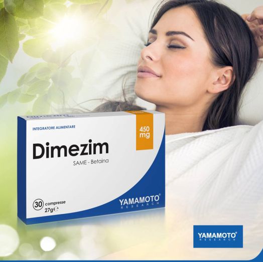 Dimezin® de Yamamoto® Nutrition es un suplemento en tabletas que proporciona 250 mg de S-adenosil-L-metionina (SAMe) y 200 mg de betaína por dosis de 1 tableta.