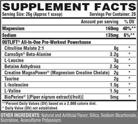 8 gramos de malato de citrulina 2:1. Cada servicio de OutLift™ Stim-Free contiene 8 gramos de malato de citrulina en una proporción 2:1 que te proporcionará unos intensos y duraderos bombeos musculares. Ningún producto de pre-entrenamiento del mercado contiene una dosis como esta.