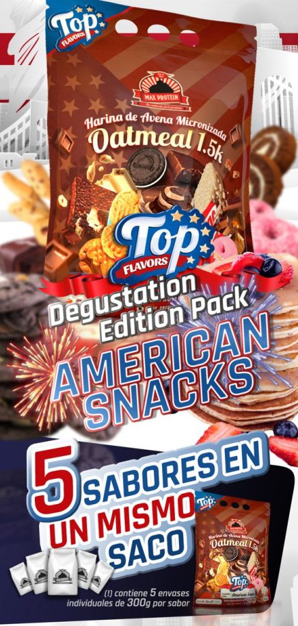 Oatmeal Top Flavors Degustación American Snacks de la línea Max Protein de Universal McGregror son las conocidas harinas de avena micronizada con los mejores sabores en un pack que incluye 5 bolsas individuales de 300 gramos con los sabores White BigChoc, BigCrac, Pink Cake, Biggers y BoomBig.