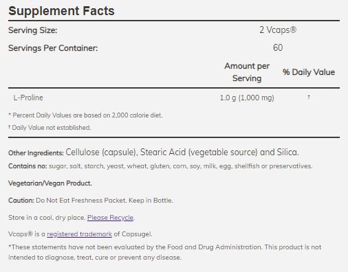 - Proporciona 500 mg del aminoácido no esencial L-prolina por cápsula.