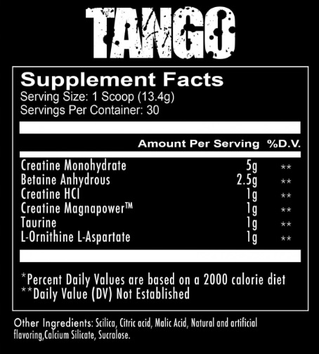 Directions For Tango Creatine Recovery: TAKE (1) SCOOP IMMEDIATELY AFTER TRAINING MIXED WITH 10-12 OUNCES OF WATER OR YOUR FAVORITE BEVERAGE; MIX WITH POST WORKOUT SHAKE IF DESIRED. FOR MAXIMUM RESULTS, TAKE UP TO (2) SCOOPS OF TANGO PER DAY. MAKE SURE TO CONSUME AT LEAST 120 OUNCES OF WATER PER DAY WHILE USING TANGO.
