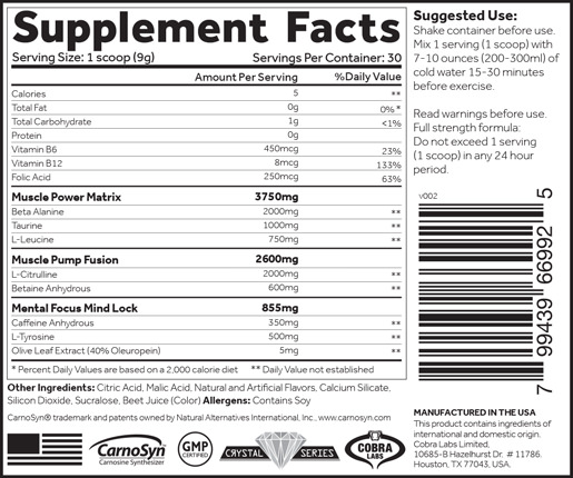 Como suplemento dietético para adultos sanos, mezclar un servicio de 9 gramos (una cucharada rasa) con entre 200 y 300 ml de agua y beber aproximadamente unos 15-30 minutos antes del entrenamiento.