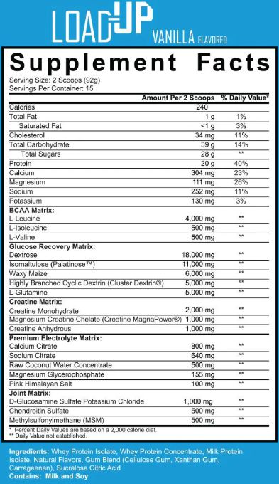 Matriz proteica Load-Up (aislado de proteína de suero, concentrado de proteína de suero, aislado de proteína de leche), cacao en polvo, Matriz de BCAAs (L-leucina, L-isoleucina, L-valina), Matriz de recuperación de glucosa (dextrosa, isomaltulosa (Palatinose™), dextrina cíclica altamente ramificada (Cluster Dextrin®), L-glutamina, maíz ceroso), Matriz de creatina: creatina magnesio quelato (Creatine MagnaPower®), monohidrato de creatina, creatina anhidra), Matriz de electrolitos premium (citrato de calcio, citrato de sodio, concentrado de agua de coco, glicerofosfato de magnesio, sal rosa del Himalaya), Matriz para el cuidado de las articulaciones: D-Glucosamina Sulfato clorhidrato de potasio, sulfato de condroitina, metilsulfonilmetano (MSM)).