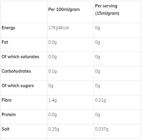 Agua, espesantes (carboximetilcelulosa de sodio, goma de xantano), saborizante, sal, ácido (ácido láctico), colorante (dióxido de titanio, caramelo E150d, extracto de curcumina), edulcorante (sucralosa), conservantes (sorbato de potasio, benzoato de sodio).