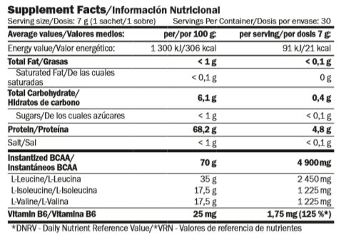 - Contiene BCAAs instantáneos (altamente solubles) con ratio 2:1:1.