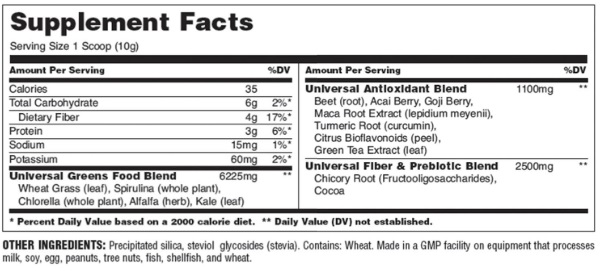 Mezcla Universal de alimentos verdes: ((Hierba de trigo (hoja), Espirulina (planta entera), Chlorella (planta entera), Alfalfa (hierba), Col rizada (hoja)), Mezcla Universal antioxidante: (remolacha (raíz), baya de acai, baya de goji, extracto de raíz de maca (lepidium meyenii), raíz de cúrcuma (curcumina), bioflavanoides cítricos (cáscara), extracto de té verde (hoja)), Mezcla universal de fibra y prebióticos (raíz de achicoria (fructooligosacáridos), cacao).
