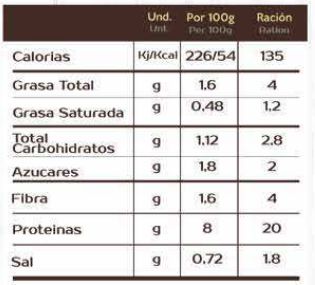135 kcal - 20 g Proteínas - 2,8 g Hidratos - 4 g Grasas