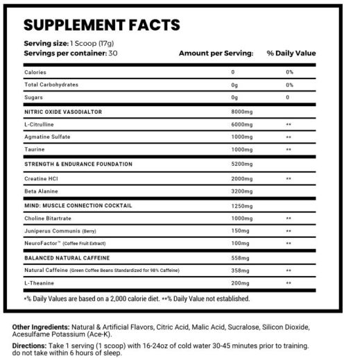 For use as a dietary supplement only by healthy adults the age of 18 and over. Do not use this product if you are nursing, pregnant, or attempting to become pregnant. Contains caffeine. Do not combine with other sources of caffeine or stimulants. Do not use for more than 12 weeks. Consult a physician before using this or any other dietary supplement. Do not take this product if you have any pre-existing medical conditions or if you are using any prescription or over the counter medication. Discontinue use and consult your health care professional if you experience any adverse health effects from this product. This product may contain ingredients banned by certain sport organizations. User accepts all risks, liabilities, and consequences in regards to testing. Do not use if safety seal is broken or missing. Use only as directed. Do not exceed recommended serving under any circumstances. KEEP OUT OF REACH OF CHILDREN.