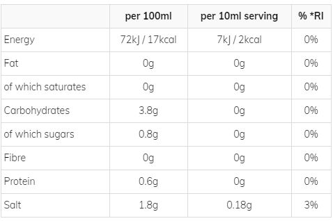 Agua, pasta de tomate (6%), espesantes (Fibra cítrica, goma de xantano), sal, ácido (ácido acético, ácido láctico), aromatizante, color (dióxido de titanio), pimentón, conservantes (sorbato de potasio, benzoato de sodio), edulcorante (sucralosa).