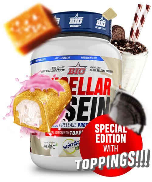 Micellar Casein with Topping de Big es un suplemento proteico en polvo que contiene una mezcla proteica de lenta digestión y gran calidad especialmente diseñada para utilizar por la noche antes de dormir, compuesta por una combinación de caseína micelar Lacprodan MicelPure® y concentrado de suero de leche Lacprodan® SP-8011V Instant.