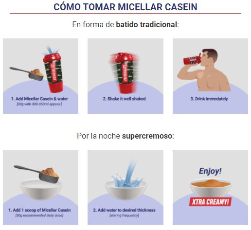La caseína micelar es un tipo de proteína de digestión lenta, por lo que es ideal para periodos de ayuno prolongado, como el periodo nocturno. La caseína micelar es una proteína de primera calidad y de liberación lenta, en la que gracias a un proceso de microfiltración a bajas temperaturas, el ingrediente final conserva todas sus cualidades y características nutricionales, a diferencia de la caseína ácida o los caseinatos. En el estómago se absorbe lentamente, lo que permite a los músculos recibir un aporte escalonado de aminoácidos durante un largo período de tiempo. Por este motivo, la caseína micelar es el suplemento de proteína ideal para tomar entre comidas y antes de acostarse. Mientras dormimos, el organismo está privado de nutrientes, ya que es poco factible que consumamos alimentos. Sin embargo, dado que la caseína micelar proporciona un aporte constante de proteínas, tu organismo evita la destrucción de masa muscular durante la noche.