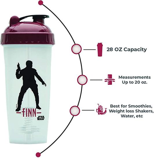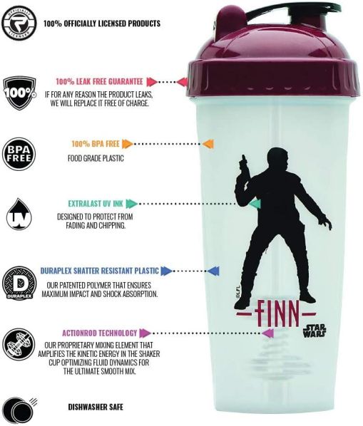Perfect Shaker Star Wars: The Last Jedi Ltd. Edition - Finn™ está realizado con plástico de alta calidad Duraplex que utiliza un polímero patentado que garantiza la máxima absorción de impactos y golpes. Tiene unas dimensiones perfectas para mezclar todo tipo de suplementos en polvo o cualquier clase de bebida y un peso ligero. También utiliza una tinta especial denominada "UV ExtraLast" para ayudar a evitar que la ilustración de la botella se raye, se decolore o se astille, por lo que siempre tendrás tu coctelera en perfectas condiciones.