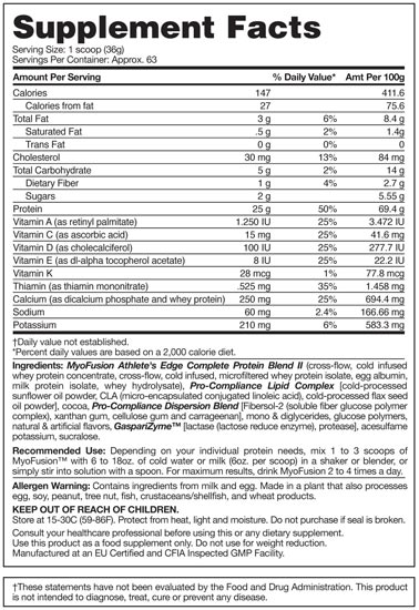 MyoFusion Athlete’s Edge Complete Protein Blend (proteína concentrada y aislada de suero elaborada mediante microfiltración y mediante un proceso de flujo cruzado en frío, albúmina de huevo, proteína de leche aislada y proteína hidrolizada), Pro-Compliance Lipid Complex (aceite de girasol en polvo microfiltrado, CLA [ácido linoleico conjugado microencapsulado] y aceite de linaza en polvo procesado en frío), Pro-Compliance Dispersion Blend (Fibersol-2 [complejo de polímeros de glucosa de fibra soluble], goma xantán, goma de celulosa y carragenano), monoglicéridos, diglicéridos, polímeros de glucosa, saborizantes naturales y artificiales, GaspariZyme™ (lactasa [enzima de reducción de la lactosa] y proteasa), acesulfamo de potasio y sucralosa.