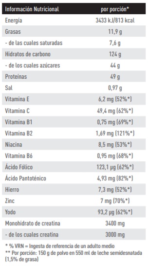 Preparado hidratos de carbono (maltodextrina de maíz, almidón de trigo nativo, harina de avena integral, almidón de patata nativa), mezcla de proteína (aislado de proteína de leche¹, concentrado de proteína de suero de leche¹, clara de huevo en polvo), 9% cacao en polvo bajo en grasa, suero de leche dulce en polvo¹, 2,3% monohidrato de creatina, triglicéridos de cadena media (de aceite de palma), aroma, edulcorantes: acesulfamo K, sacarina sódica, sucralosa; espesante: goma guar; antiaglomerante: dióxido de silicio; colorante: beta-caroteno; ácido l-ascórbico, pirofosfato de hierro (III), vitamina E, niacina, oxido de zinc, ácido pantoténico, vitamina B6, tiamina, riboflavina, ácido fólico, yoduro de potasio.