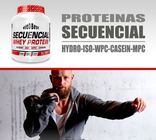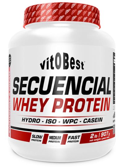 Secuencial Whey Protein de Vitobest es un suplemento proteico en polvo que combina diferentes fuentes proteicas con distinta velocidad de digestión entre las que se incluye concentrado de proteína de suero WPC Lacprodan® 80, aislado de proteínas lácteas (MPI caseína 90), L-glutamina (Ajinomoto®), aislado de proteína de suero WPI Lacprodan® 90 y aislado de proteína de suero hidrolizado (HydroClear®).