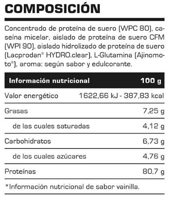 Contiene aislado de proteína de suero WPI Lacprodan® 90 producido por Arla, que es considerada por muchos como el mejor aislado de suero del mundo, debido a su gran pureza, excelente aminograma y máxima biodisponibilidad, con uno de los valores biológicos más altos del mundo. El aislado de proteína de suero es la forma más avanzada de proteína de suero, con más de un 90% de proteínas y una proporción ínfima de grasas y lactosa. Gracias a un Valor Biológico (VB) mayor que el de cualquier otra proteína, el aislado de proteína de suero contiene altos niveles de aminoácidos esenciales y no esenciales.