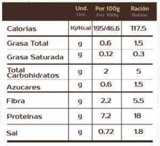 117 kcal - 18 g Proteínas - 5 g Hidratos - 1,5 g Grasas