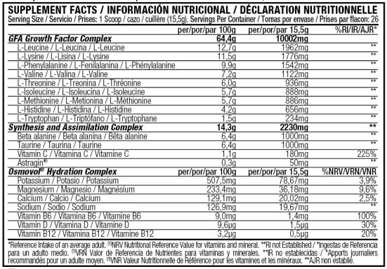 Además de los 9 aminoácidos esenciales también contiene taurina, beta alanina, Astragin® y Osmovol+ Hydration Complex®, una nueva fórmula patentada, con una dosis exacta de minerales y vitaminas diseñada para mejorar la absorción de nutrientes, las reacciones nerviosas y la función muscular, previniendo además de calambres y dolores musculares.