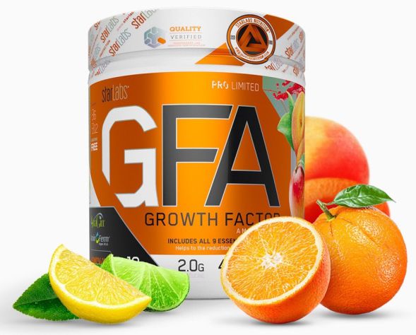 GFA Growth Factor™ de StarLabs es un suplemento en polvo que contiene una fórmula con los 9 aminoácidos esenciales en la proporción recomendada por la National Academy of American Sciences para maximizar la síntesis proteica en adultos de más de 19 años.
