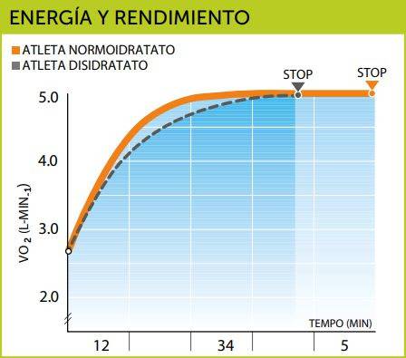 > Consumo de oxígeno (litros x min-1) para una carga de trabajo que puede ser soportada por un atleta para 5,5 min. en condiciones normales, pero sólo por 3.5 min. en el caso de la deshidratación.