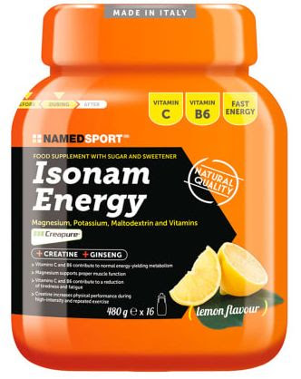 Isonam Energy de Named Sport es un suplemento en polvo que contiene una fórmula isotónica (314,24 mosm/L) a base de maltodextrina, minerales y vitaminas enriquecida con creatina Creapure® y ginseng, ideal para una reintegración de la energía, los electrolitos y una hidratación adecuada en caso de rendimiento físico prolongado o una transpiración excesiva.