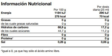 Palatinose™ 32,8% (isomaltulosa*), maltodextrina 27,47%, agua, dextrosa 8,32%, fructosa 3,33%, sabores, acidificantes: ácido cítrico; D-Ribosa 0,83%, conservante: sorbato de potasio.