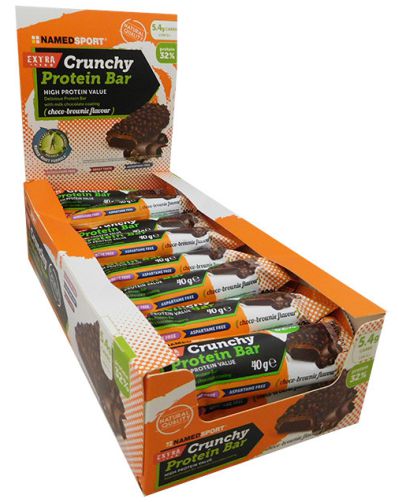 Crunchy Protein Bar de Named Sport son unas deliciosas barritas con cobertura de chocolate negro, una capa de delicioso caramelo y crispies de soja, muy bajas en azúcares, altas en fibra y que te proporcionan 13 gramos de proteína por unidad de 40 gramos.