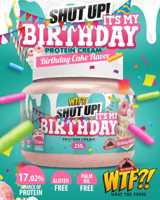 Shut Up! It's my Birthday forma parte de la nueva familia de cremas untables WTF?! (What the Fudge?!), altas en proteínas y bajas en azúcares naturalmente presentes. Ningún producto de la familia de cremas untables WTF?! contiene aceite de palma o gluten... y sus divertidos sabores seguro que te sorprenderán.