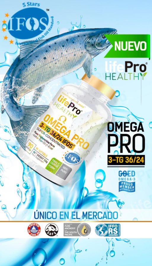 Omega PRO de LifePro Nutrition es un suplemento en perlas que contiene ácidos grasos Omega 3 del tipo EPA y DHA en forma de triglicéridos (su forma más biodisponible, mejor que etil-éster) y con la certificación IFOS de 5 estrellas que garantiza la más alta calidad de Omega 3.