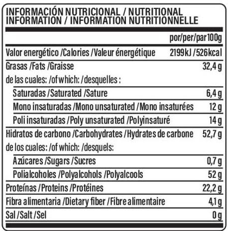 Edulcorante (maltitol*), aceite vegetal (girasol), Caseína MPI 90% (20%), cacao desgrasado en polvo (11.0%), pasta de avellanas (4.0%), emulgente (E 322), grasa vegetal girasol no hidrogenada y aromas.