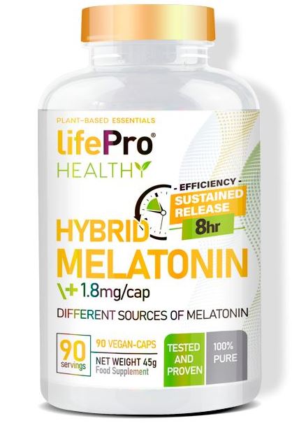 Hybrid Melatonin de LifePro Nutrition es un suplemento en cápsulas que proporciona 1,8 mg de melatonina de liberación híbrida (rápida y prolongada) con un efecto de hasta 8 horas de duración para conseguir un sueño profundo, sostenido y reparador.