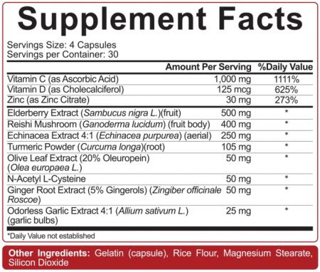 Extracto de fruta de saúco - 500 mg - Este ingrediente es un ingrediente común y eficaz para el resfriado y la gripe. Es una hierba medicinal que se usa típicamente para combatir infecciones, como bronquitis, sinusitis, gripe y resfriado común. Las bayas son ricas en antioxidantes, flavonoides, polifenoles y vitaminas. No es de extrañar que sea un potenciador inmunológico tan popular. (8)