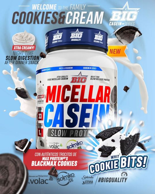 Micellar Casein Black Max Cookies de Big es un suplemento proteico en polvo que contiene una mezcla proteica de lenta digestión y gran calidad especialmente diseñada para utilizar por la noche antes de dormir, compuesta por una combinación de caseína micelar Solmiko® y concentrado de suero de leche Volactive®.