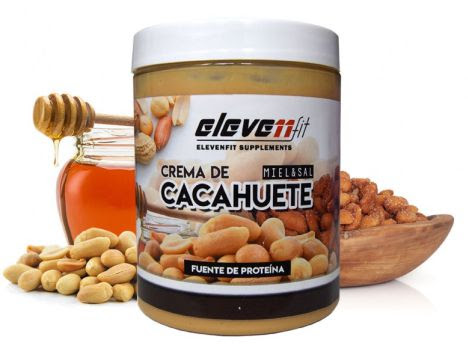 Crema de Cacahuete Miel y Sal de ElevenFit Supplements es una crema de cacahuete con sabor a miel y sal perfecta para complementar nuestra dieta consumiéndola directamente o añadiendola a todo tipo de recetas o postres.