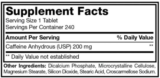 Cafeína anhidra, dicalcio fosfato, celulosa microcristalina, antiaglomerante: estearato de magnesio, dióxido de silicio, ácido esteárico, sodio croscarmeloso.