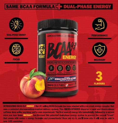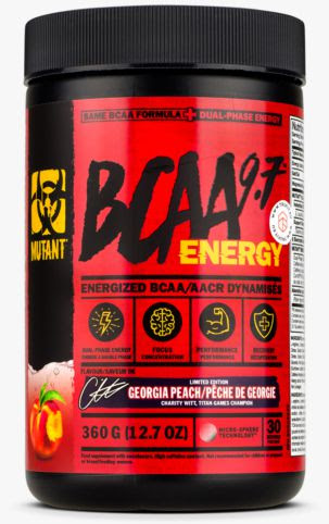 Mutant BCAA 9.7 Energy de Mutant® es una fórmula en polvo a base de aminoácidos solubles que proporciona 7.2 gramos de aminoácidos ramificados en polvo en una proporción 2:1:1 (leucina:isoleucina:valina) por dosis, además de 2.5 gramos de otros importantes aminoácidos micronizados (taurina, glicina, L-glutamina, L-arginina, L-tirosina); en su versión energética con cafeína de doble acción, hoja de té verde y extracto de grano de café verde.
