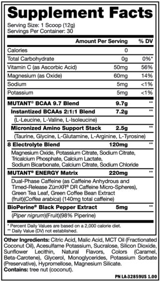 Mutant BCAA 9.7 Blend (instantized BCAAs 2:1:1 (Leucina, L-Valina, L-Isoleucina), Support Blend (Taurina, Glicina, L-Glutamina, L-Arginina, L-Tirosina)), 8 Electrolyte Blend (Óxido de Magnesio, Citrato de Potasio, Citrato Sódico, Fosfato Tricálcico, Lactato de Calcio, Bicarbonato de Sodio, Citrato de Calcio, Cloruro de Sodio), Mutant Energy Matrix (Dual Phase (cafeína anhidra, Timed-Release ZumXR® DR (microesferas de cafeína), hoja de té verde, extracto de grano de café verde), Absorption Agent-Bioperine® (Piper Nigrum ((Fruta) 95% Piperina)).
