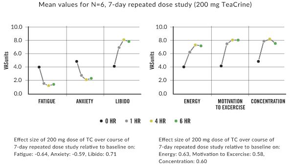 A diferencia de la cafeína, TeaCrine no tuvo ningún impacto en la presión arterial, la frecuencia cardíaca, la irritabilidad o el nerviosisimo de la dosis aguda (125 mg). Esto significa que TeaCrine no es un estimulante, aunque combina bien con estimulantes como la cafeína. Esto es importante para quienes son sensibles a la cafeína, pero desean mejorar la energía, el estado de ánimo y la concentración.