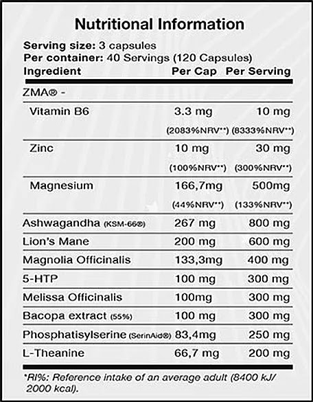 ZMA [citrato de magnesio, aspartato de zinc y magnesio, zinc 1-monometionina, clorhidrato de piridoxina], ashwagandha orgánica (de KSM-66), polvo de hongo de melena de león (hericium erinacaus), magnolia officinalis, 5-HTP, Melissa officinalis, cubierta de cápsula [gelatina, color (dióxido de titanio)], bacopa (Bacopa monnieri) extracto de planta completo (estandarizado al 55% de bacósidos), agente de carga (maltodextrina), fosfatidilserina, L-teanina, agentes antiaglomerantes (dióxido de silicio, sales de calcio del ácido ortofosférico).
