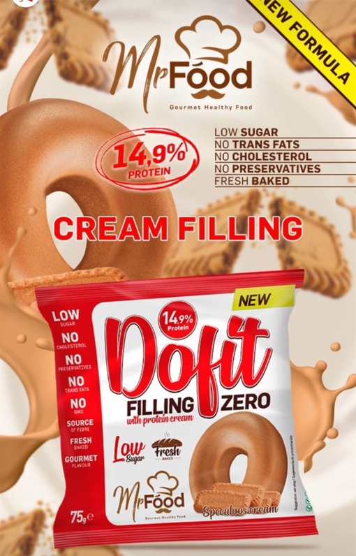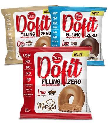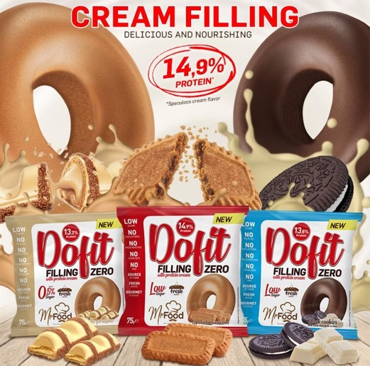 Dofit Filling Zero no sólo te ofrece un aporte nutricional excepcional, sino que también tiene todo el sabor de unas rosquillas con sabor a Black cookies con chocolate blanco, White praline o Crema de speculoos.