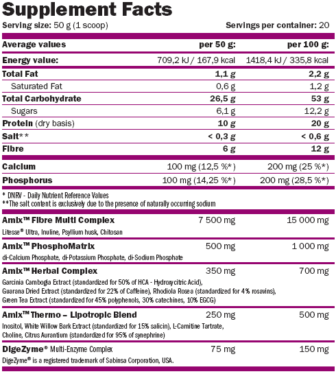 Maltodextrina (polímero de glucosa), mezcla de proteínas (concentrado de proteína de suero instantáneo procesado a baja temperatura ultrafiltrado a partir de leche, suero de leche (sin grasa), aminoácidos derivados de aislado de proteína de carne de vaca, caseína micelar), fructosa cristalizada pura, inulina, cáscara de psyllium, lecitina de soja, estabilizantes xantano y goma guar, quitosano, fosfato di-calcio, aroma, HCA, fosfato di-potasio, fosfato di-sodio, inositol, guggul extracto lipídico, extracto de guaraná (estandarizado para 22% de cafeína), mezcla patentada de enzimas digestivas Digezyme® (Amilasa, lipasa, lactasa, celulasa, proteasa bacteriana neutra), extracto de té verde, extracto de corteza de sauce blanco (15% de salicina), L-carnitina tartrato, colina, edulcorantes: Sucralosa (Splenda), acesulfamo K, extracto de citrus aurantium (95% Sinefrina).