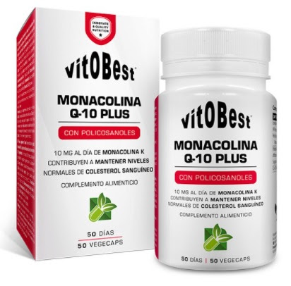 Monakolina Q-10 Plus de Vitobest® es un suplemento en cápsulas elebaorado a base de levadura de arroz rojo (4% de monacolina K), policosanoles de caña de azúcar (10% octacosanol) y coenzima Q10 fermentada por levadura (Kaneka™),