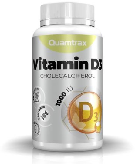 Vitamin D3 de Quamtrax Nutrition es un suplemento en cápsulas que proporciona 25 µg (1000IU) de vitamina D3 como colecalciferol con gran poder de absorción, una vitamina esencial liposoluble que a menudo se la conoce como “la vitamina del sol“.