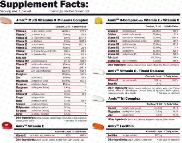Amix Multi vitamins (Vitamina A, Vitamina C, Vitamina B1, Vitamina B2, Vitamina B3, Vitamina D3, Vitamina E, Vitamina B6, Ácido fólico, Vitamina B12, Vitamina B5, Calcio, Fosfato, Zinc, Magnesio, Manganeso, Biotina, Vitamina K, Cobre, Yodo, Selenio, Molibdeno, Cromo, Hierro, Silicio, Boro); Amix Vitamin E 400 I.U (Vitamina E); Amix B-complex with Vitamin E (Vitamina C, Calcio, Vitamina B5, Vitamina E, Vitamina B3, Vitamina B1, Vitamina B2, Vitamina B6, Ácido fólico, Biotina, Vitamina B12, Zinc); Amix Vitamin C-Timed release (Vitamina C, Escaramujo); Amix Tri complex (Calcio, Magnesio, Zinc); Amix Lecithin (Lecitina).