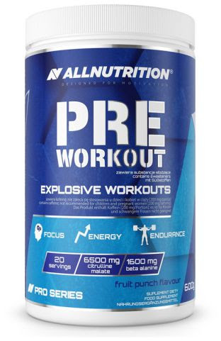 PRE Workout de AllNutrition es un suplemento en polvo para tomar antes del entrenamiento que contiene una fórmula avanzada para ayudarte a mejorar el rendimiento físico gracias a una potente dosis de 6,5 g de citrulina malato, 3,5 g de BCAAs con ratio 2.1.1., 3 g de leucina, además de beta alanina, betaína anhidra, clorhidrato de creatina y muchos ingredientes más.