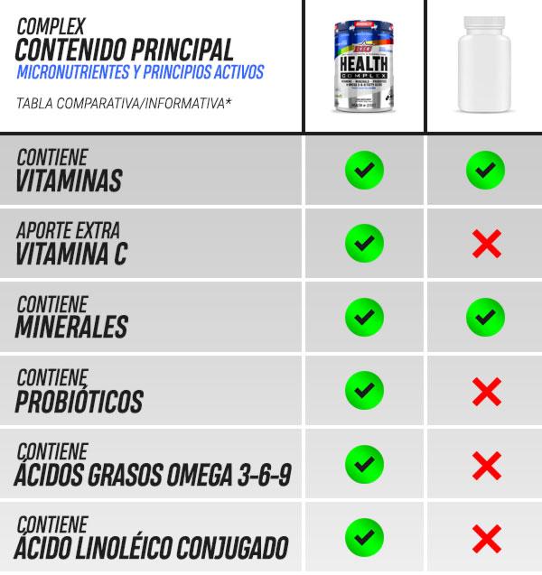 Recuerda que Health Complex no es un simple complejo multivitamínico. Este producto recoge una serie de componentes que aseguran el equilibrio y el rendimiento del organismo para afrontar inclusive situaciones de alto rendimiento deportivo. Además del aporte vitamínico y mineral habitual, Health Complex aporta ácidos grasos omega 3-6-9, ácido linoleico conjugado, probióticos y antioxidantes.