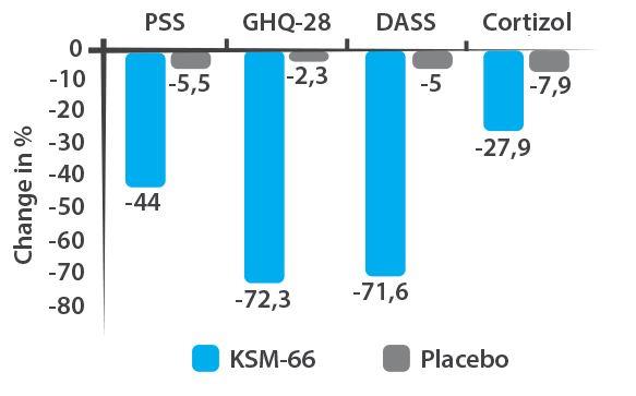 La suplementación con KSM-66 durante 60 días causó una reducción del 44% del nivel de estrés evaluado con el uso del cuestionario PSS (escala de percepción del estrés) y la reducción del número de puntos obtenidos en la prueba de GHQ-28, que es una prueba que se utiliza para determinar la salud psicológica. El cuestionario final fue el cuestionario DASS, que mide la depresión, la ansiedad y el estrés. En el grupo que tomaba KSM-66 los resultados obtenidos para cada uno de estos componentes mostraron una reducción significativa.