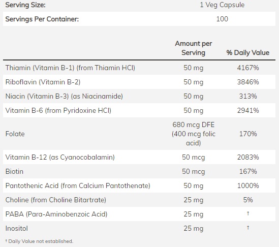 Tiamina (vitamina B1) (tiamina HCl), Riboflavina (vitamina B2), Niacina (vitamina B3) (como niacinamida), Vitamina B6 (piridoxina HCl), Folato (ácido fólico), vitamina B12 (como cianocobalamina), Biotina, Ácido pantoténico (pantotenato de calcio), Colina (bitartrato de colina), PABA (Ácido para-aminobenzoico), Inositol.