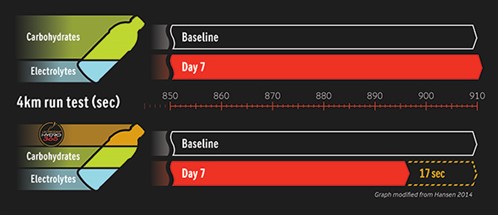 La prueba de carrera se realizó inicialmente antes del seminario y se repitió después de la finalización de las 13 sesiones de entrenamiento que se llevaron a cabo durante la semana, lo que posibilitó la comparación del impacto del suplemento de Lacprodan® HYDRO.365 durante el seminario. Los resultados demostraron que los deportistas que consumieron Lacprodan® HYDRO.365 antes y después del entrenamiento tuvieron un mejor rendimiento en una prueba de carrera final de 4 km (mejora media: 17 segundos) que el grupo que solo consumió bebidas deportivas (disminución media: 3 segundos). El grupo de proteína de suero también tuvo un daño muscular reducido en comparación con el grupo que solo consumió la bebida deportiva.