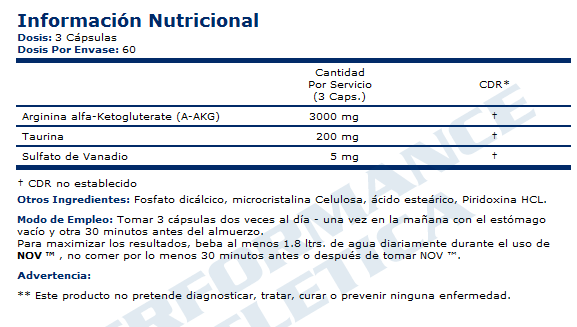 NOV incluye además vanadil, que incrementa muchos de los procesos anabólicos que la insulina lleva a cabo y que provocan que la glucosa y los aminoácidos se dirijan a los músculos en mayores cantidades. Dymatize también le ha añadido a este excelente producto taurina, que ayuda a mejorar la absorción de agua y de nutrientes en las células musculares, además de actuar en la digestión de las grasas y en el control de los niveles de colesterol.